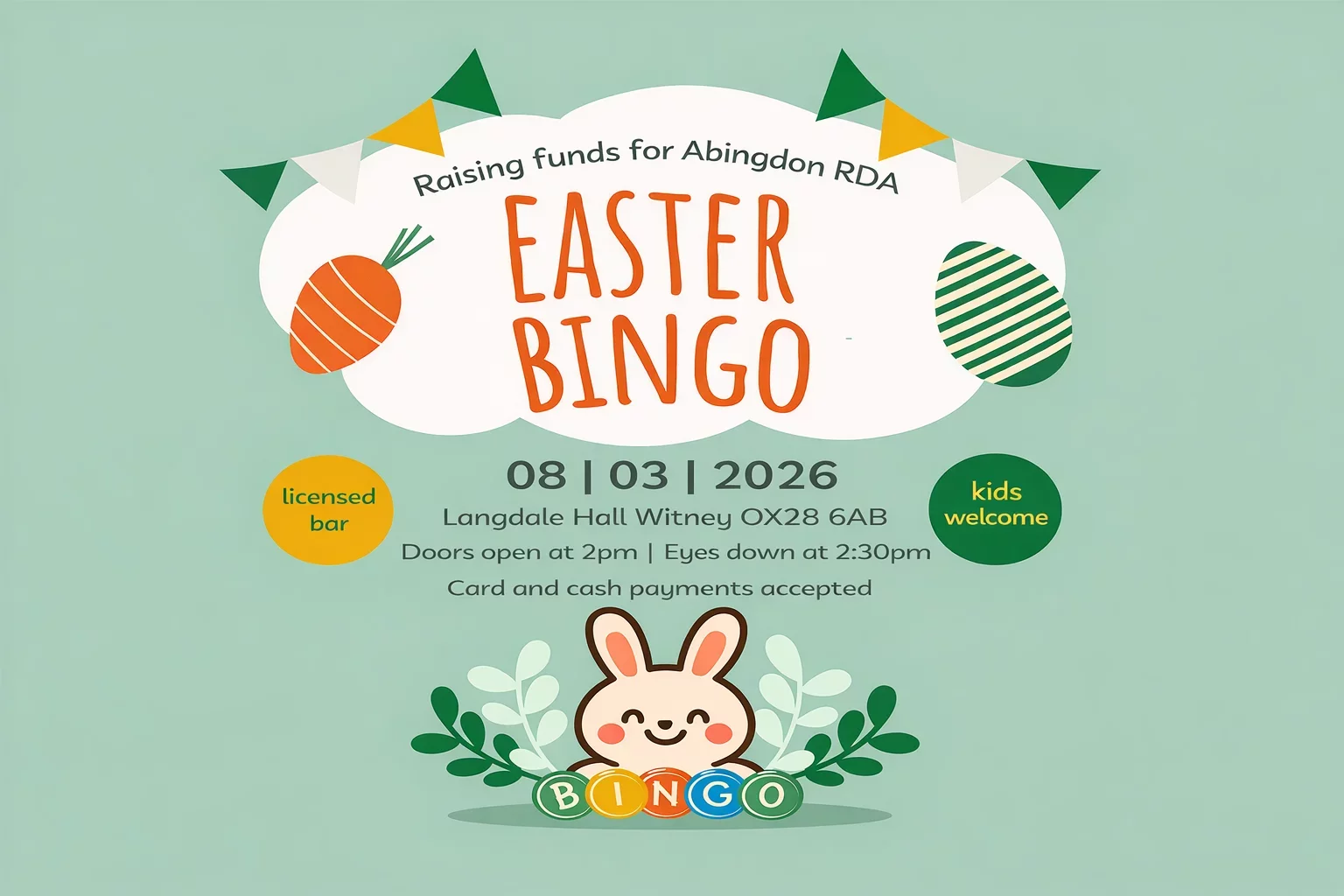 Join us for a fun-filled Easter Bingo afternoon in support of Abingdon RDA. A family-friendly event with prizes to be won, a licensed bar, and a warm community atmosphere — all while raising vital funds for a great cause.